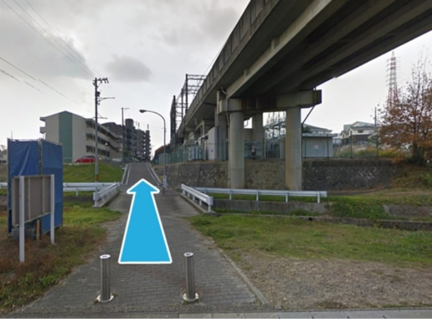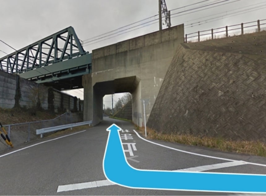 小さな川を越え、住宅街を線路沿いに約300m歩きます。